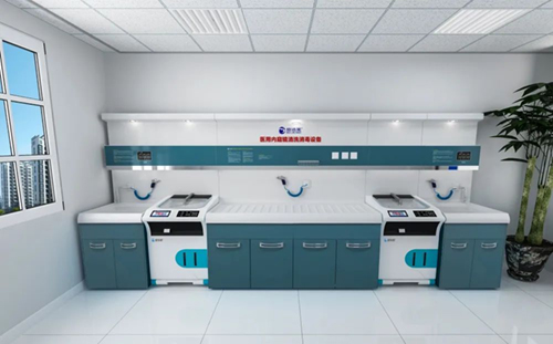 待清洗的内镜在清洗槽进行初步的清洗处理,然后放入内镜自动清洗消毒机内进行全自动、全浸泡式的清洗消毒,完成后拿出内镜放在干燥台上进行干燥处理。清洗槽和干燥台的台面是由进口高分子复合材料一次压铸而成,附杜邦抗菌材料,表面平整光滑,无锋角接缝,抗菌,耐酸碱腐蚀。